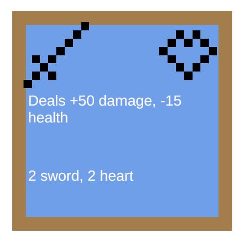Explanation of CardsEach card in the game has 1 or 2 icons, an ability, and a pre-requisite.![]() Consider the above card. It has two icons: a sword and a heart. The ability is it deals 50 damage to the enemy and damages the player for 15 damage. The prerequisite means there must be at least 2 sword and 2 heart icons in the stack for the ability to be used. Some cards are destroyed upon using their ability. |